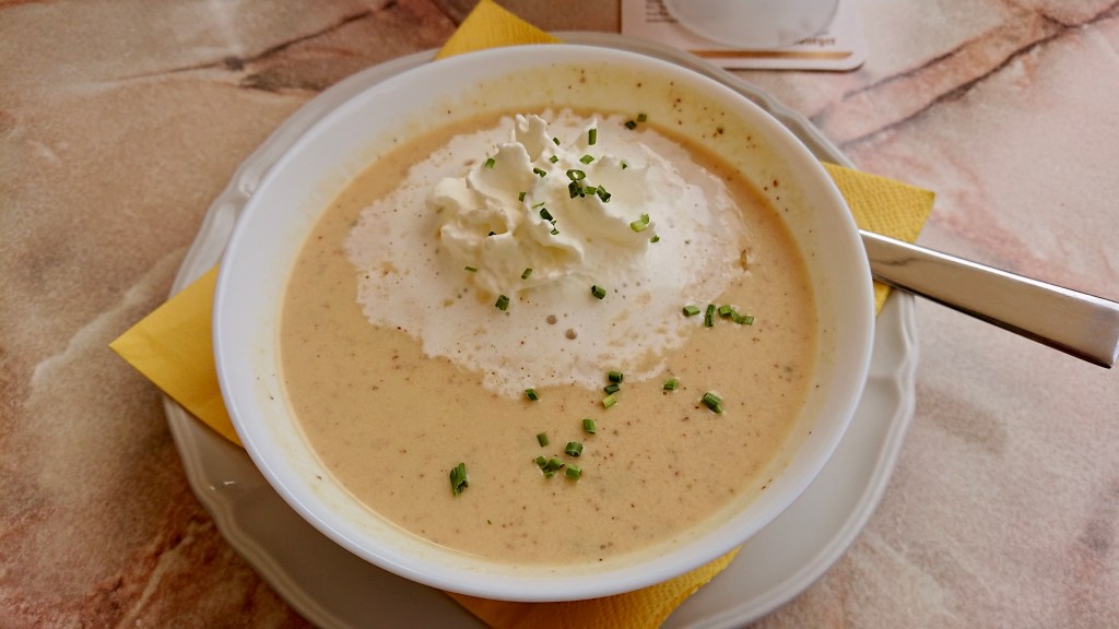 Also, today we tatsed a very special food from Eifel (a mountain region near Germany-Belgium border): Senfsuppe. In translation, it means mustard soup. At first, I didn’t imagine at all if this can actually be a food. To me, mustard is just a sauce that goes together with meat, sausage, etc. We got all curious about its taste, and decided to have one bowl for each. Surprisingly, the taste was actually quite nice. It didn’t have much strong taste of mustard and it was quite harmonious with other ingredients (probably cream, potato, leek?). Also, we were a bit frozen due to cold weather, and Seufsuppe was really perfect.