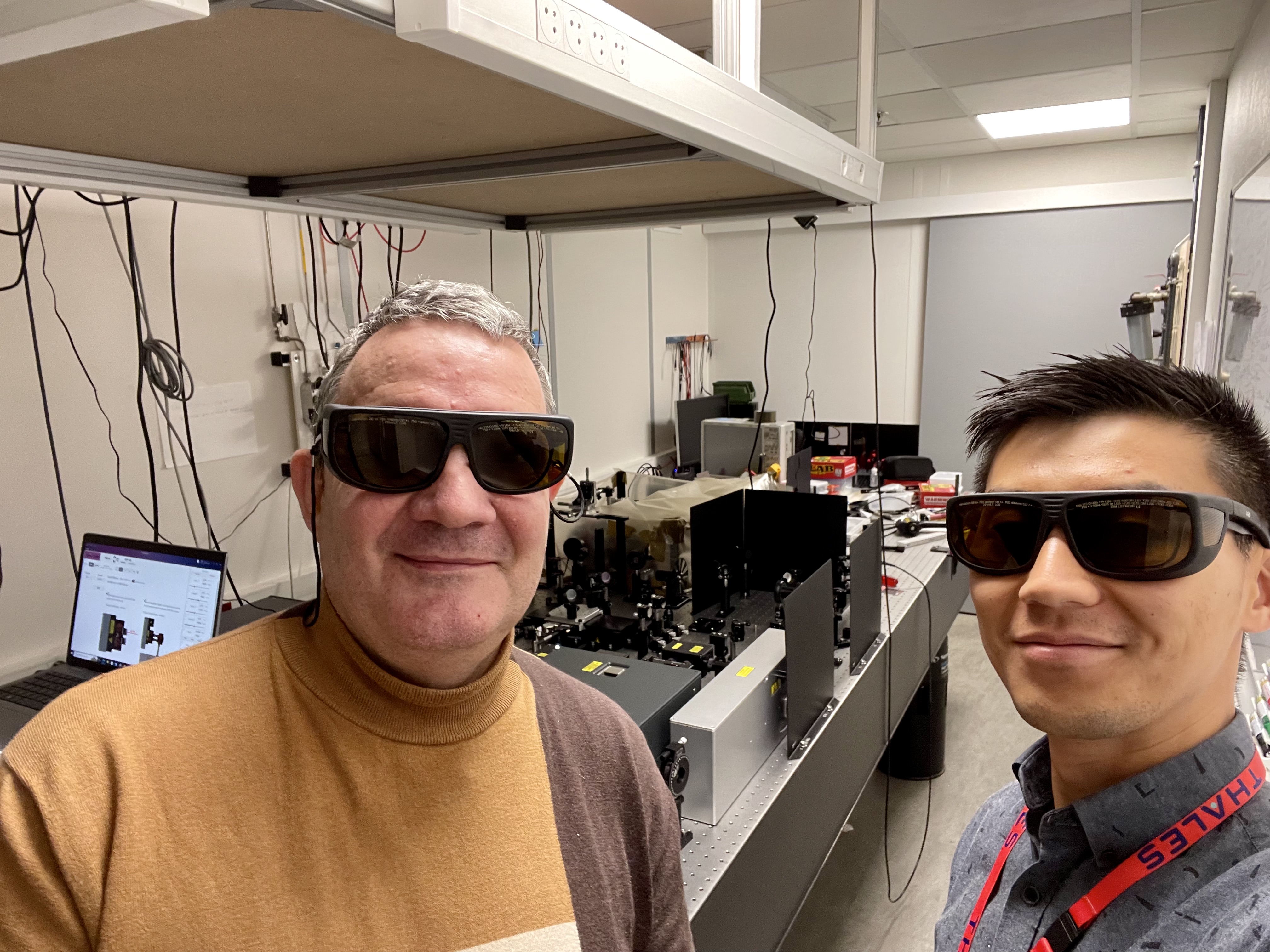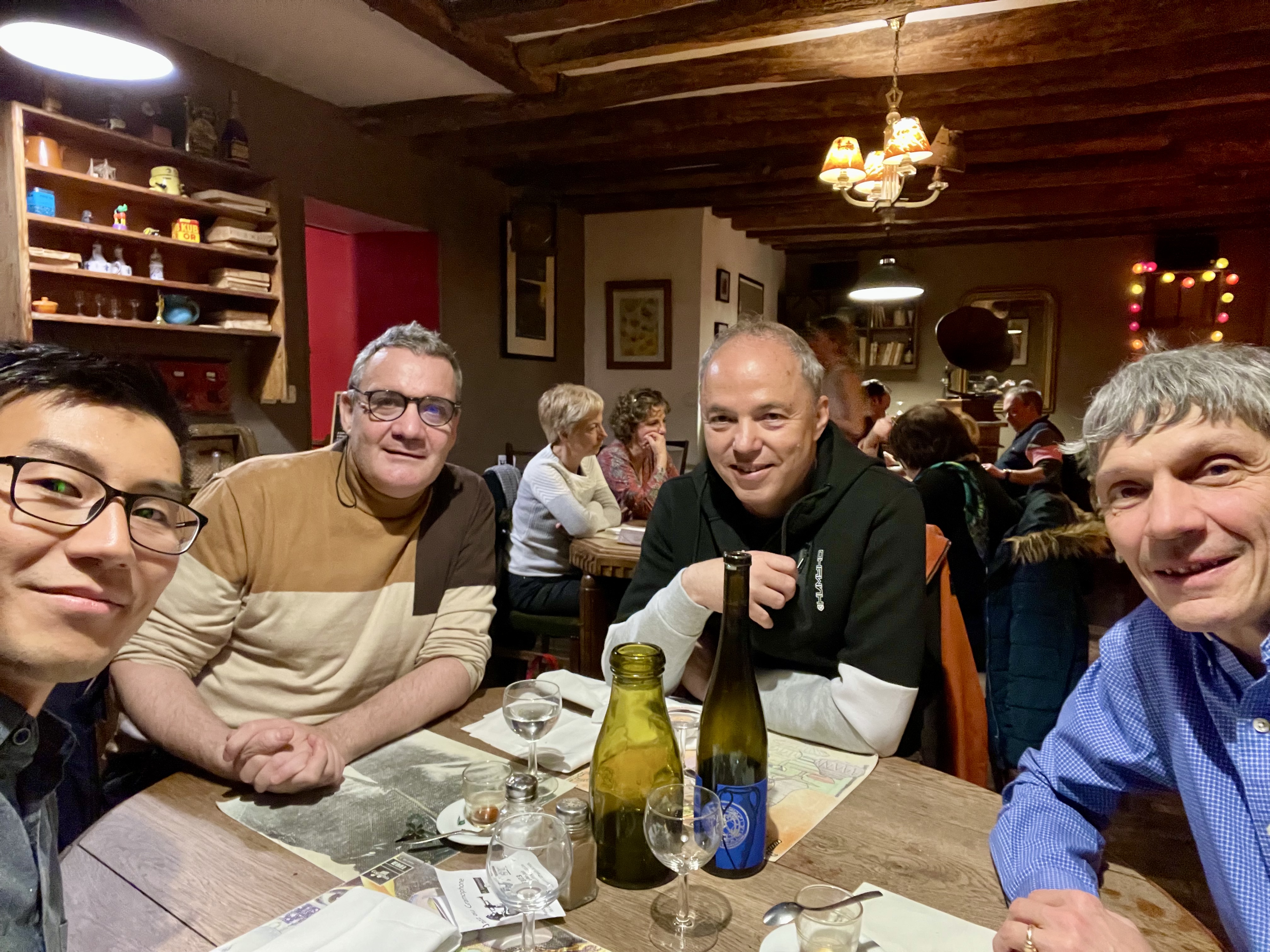 Left: Nice warm evening dinner (from the left: me, Henri Jaffres, Michael Viret, and Andre Thiaville). Right: In the THz spectroscopy lab of Henri Jaffres.