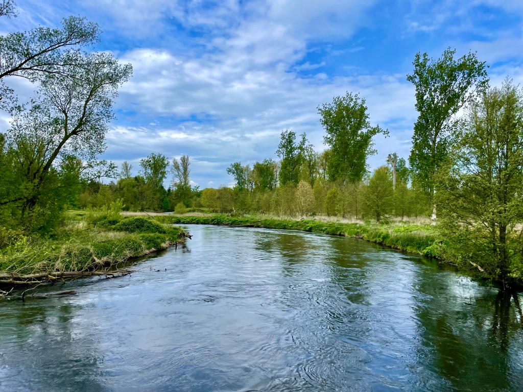 Today, I discovered a very nice walking trail near Jülich. As the spring has arrived, now everything is becoming green. It still rains from time to time, but I enjoy this weather because it does not get too hot, like in May. The trail was full of nature along the river Rur, and we were able to see many birds, wild flowers, and a deer.
