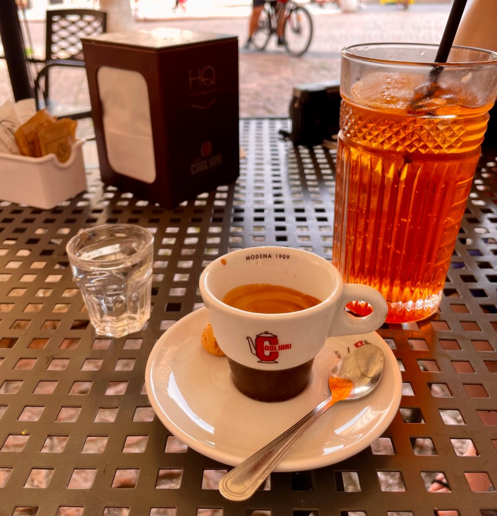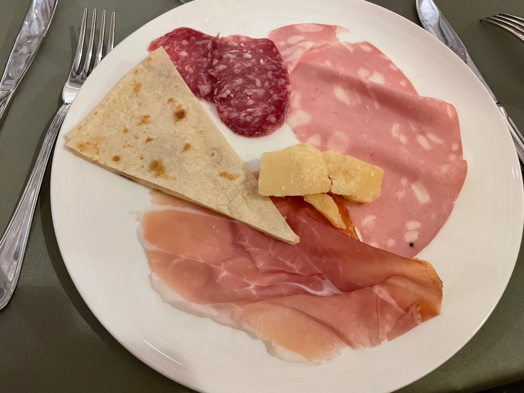 Typical Italian experience. Coffee and Aperol Spritz (left). Plate of hams; Prosciutto, Coppa, Mortadella, and old Parmigiano (right).
